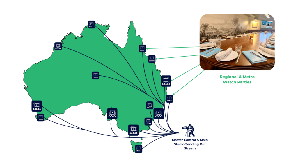 Your communication becomes a live TV style event  delivered simultaneously to hosted gatherings across  the country.